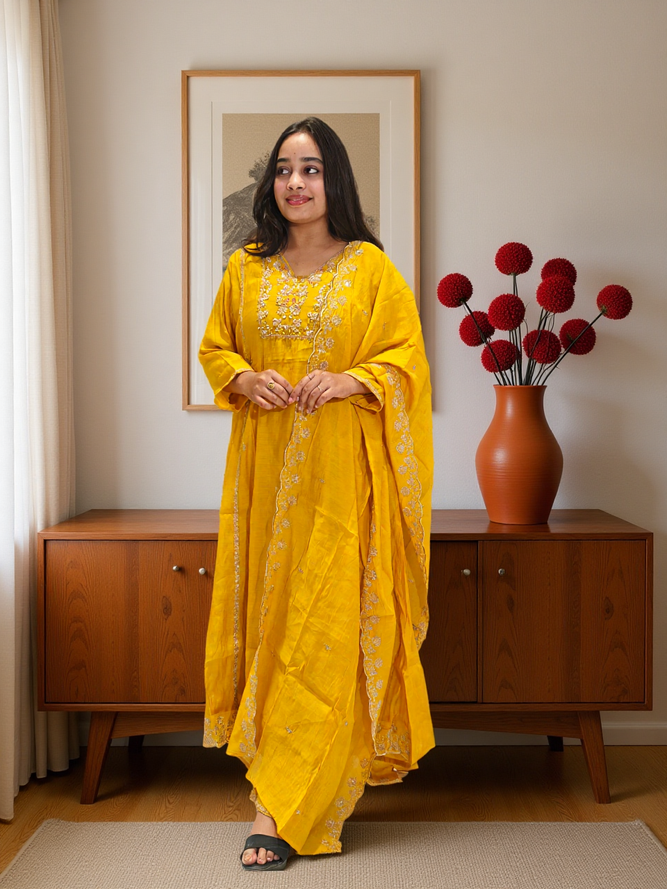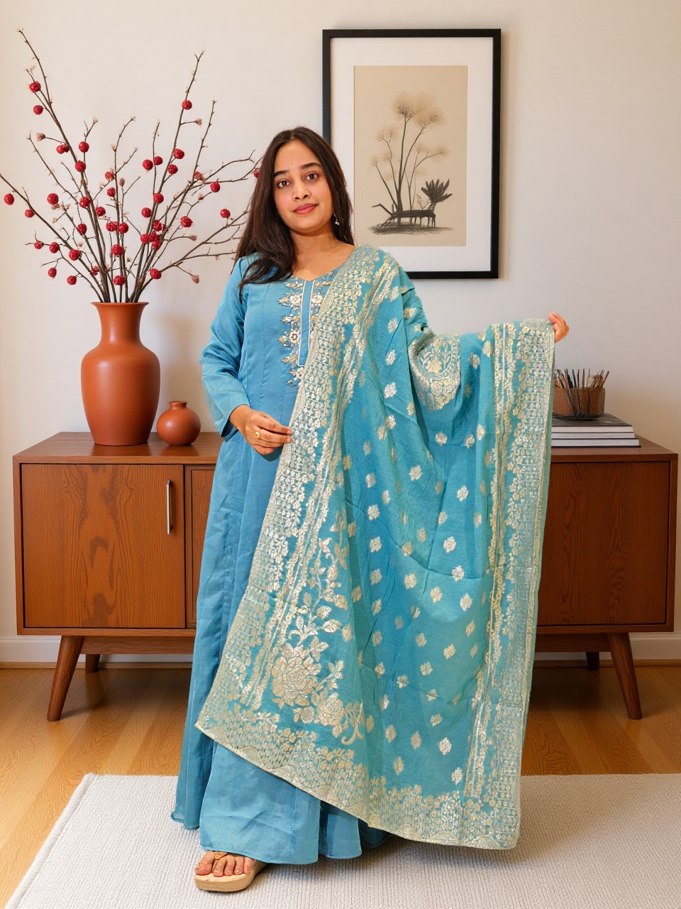 Ikkat Raw Silk Thread And Print Work Chudidar Kali